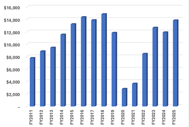 Below is a chart showing Disney’s operating profit ($mm) per year. They obviously had a big drop during the Covid pandemic. They are only now getting back to the pre-Covid levels.